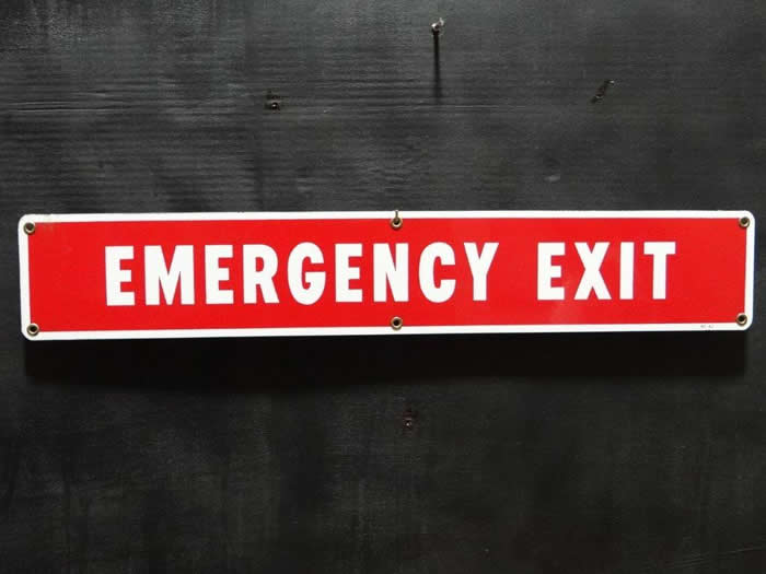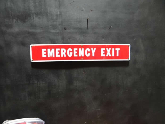 "Emergency Exit Painted & baked Finish Sign in great original condition. It measures 24 inches long x 4 inches high and is marked "MS-42".